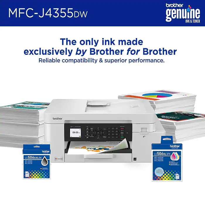 The Brother INKvestment 4355 (MFC-J4355DW) combines reliable all-in-one functionality with flexible connectivity and efficient media handling, making it ideal for everyday document tasks in a home or small office environment. It uses Brother’s INKvestment ink system — delivering good page yields and sharp text/color output — with print speeds up to 20 ppm (black) and 19 ppm (color).