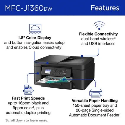 The Brother Work Smart 1360 Wireless Color Inkjet All-in-One Printer (MFC-J1360DW) is an affordable multifunction inkjet printer designed for home and small office use. It delivers print, copy, and scan capabilities with wireless connectivity, automatic duplex (two-sided) printing, and a 1.8″ color display for easy navigation. It also supports mobile printing via the Brother Mobile Connect app.